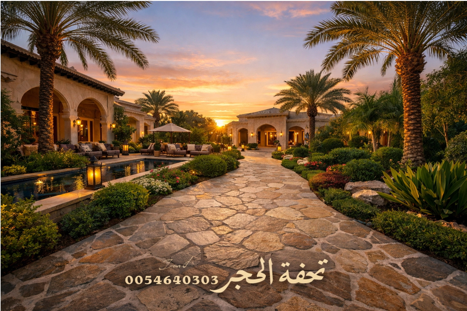 الحل: قمنا بتصميم وتركيب واجهة كاملة للفيلا باستخدام الحجر الرياضي العشوائي بألوانه الفاتحة الدافئة، مما أضفى عليها طابعًا مهيبًا وأنيقًا. كما تم استخدام نفس النوع من الحجر في ممرات الحديقة وأرضيات الفناء الخارجي، مع تنسيق دقيق للأحجام والأشكال لخلق مسارات عضوية تتناغم مع تصميم الحديقة. تم دمج إضاءة أرضية مخفية لإبراز جمال الحجر ليلاً.
