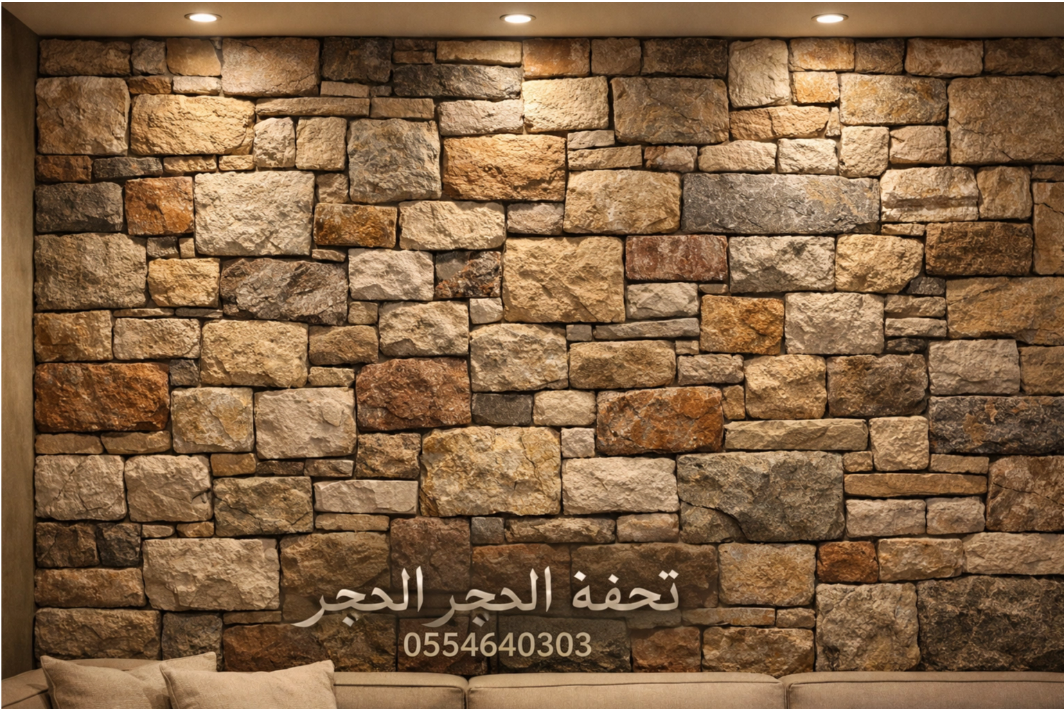 جدران غرف المعيشة والاستقبال: يمكن استخدام جدار واحد من الحجر العشوائي كجدار مميز (Accent Wall) في غرف المعيشة أو الاستقبال، لإضفاء لمسة فنية وجذابة.
