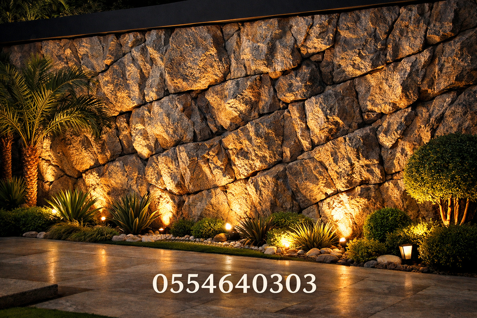 2. جدران حجرية فنية مع إضاءة مخفية